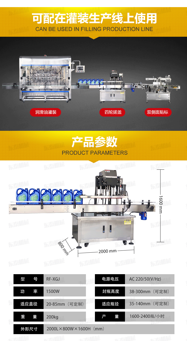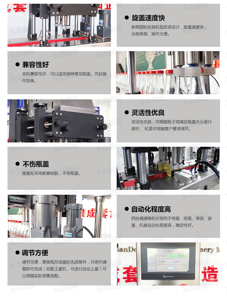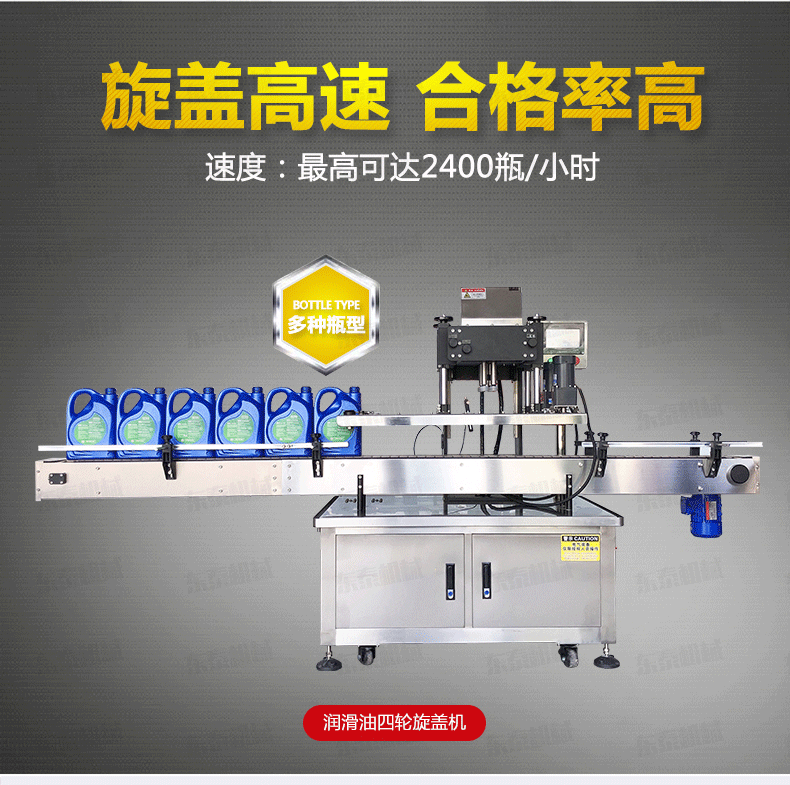 全自動(dòng)旋蓋機(jī)是參照國(guó)機(jī)型改進(jìn)設(shè)計(jì)、旋蓋速度快,合格率高、操作方便?蛇m用于食品、制藥、日化、農(nóng)藥、化妝品等行業(yè)的不同瓶形的旋蓋。四臺(tái)調(diào)速電機(jī)分別用于供蓋、夾瓶、傳送、旋蓋,機(jī)器自動(dòng)化程度高,穩(wěn)定性好,調(diào)節(jié)方便,更換瓶形或蓋時(shí)無(wú)須備件,只需作調(diào)整即可完成(如配上蓋機(jī),可進(jìn)行自動(dòng)上蓋)可以根據(jù)實(shí)際需要選配。