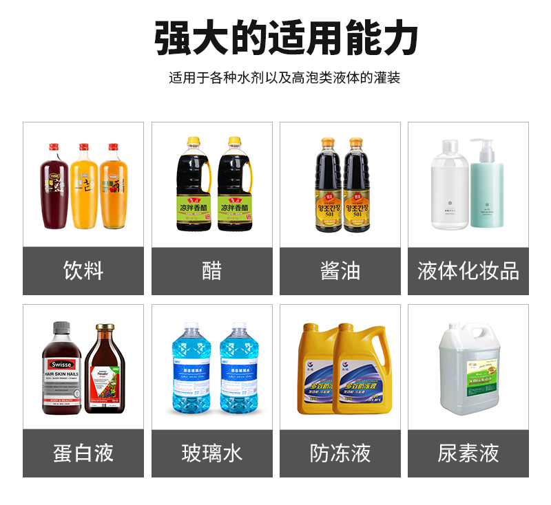 雙頭液體定量灌裝機(jī)適用于各種水劑以及高泡類液體的灌裝。如:飲料、醋、醬油、液體化妝品、蛋白液、玻璃水、防凍液、尿素液等