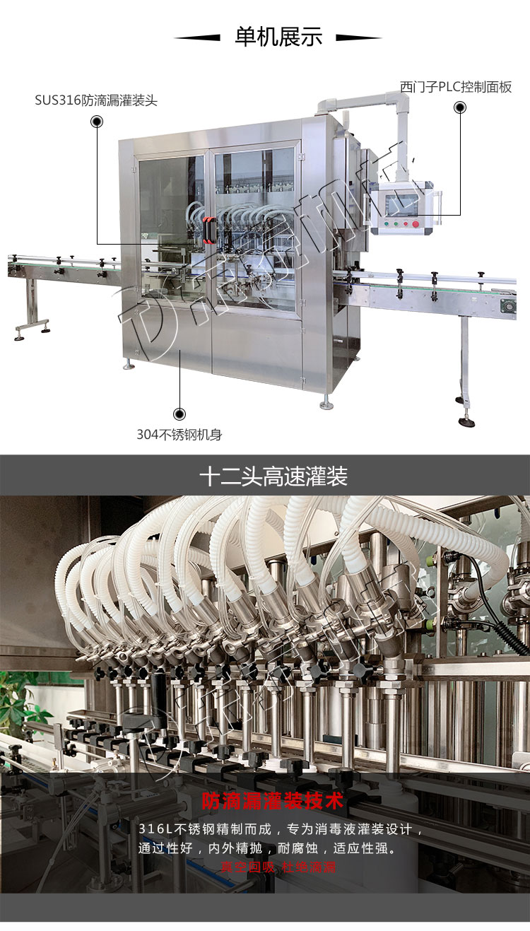 5、具有無(wú)瓶不灌裝、自動(dòng)進(jìn)瓶出瓶、自動(dòng)定位灌裝、自動(dòng)控制液位等功能,自動(dòng)化程度高;灌裝嘴設(shè)計(jì)科學(xué)合理,配防滴漏裝置,灌裝不滴漏,擁有物料瓶及設(shè)備的干凈衛(wèi)生。