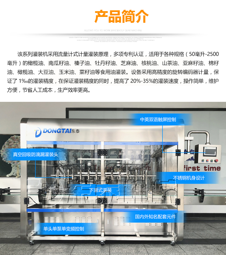 東泰機械至今有著二十年的研發生產經驗,擁有著精良的技術團隊,東泰研發的橄欖油自動灌裝機,橄欖油灌裝流水線都是機電一體的新型設備,橄欖油自動灌裝機計量采用高精度流量計與微電子數控儀表相結合的方式,灌裝精度相當高,還可以方便的進行無級調解灌裝容量,非常直觀,操作非常簡單。選擇包裝設備就要選經驗豐富、技術超前,設備完善的的大企業,東泰機械通過二十多年的努力和發展,現已成為集科研、設計制造、成套供應、技術咨詢服務、工程總承包為一體的高科技型企業。東泰期待與您的合作,我們互利共贏!